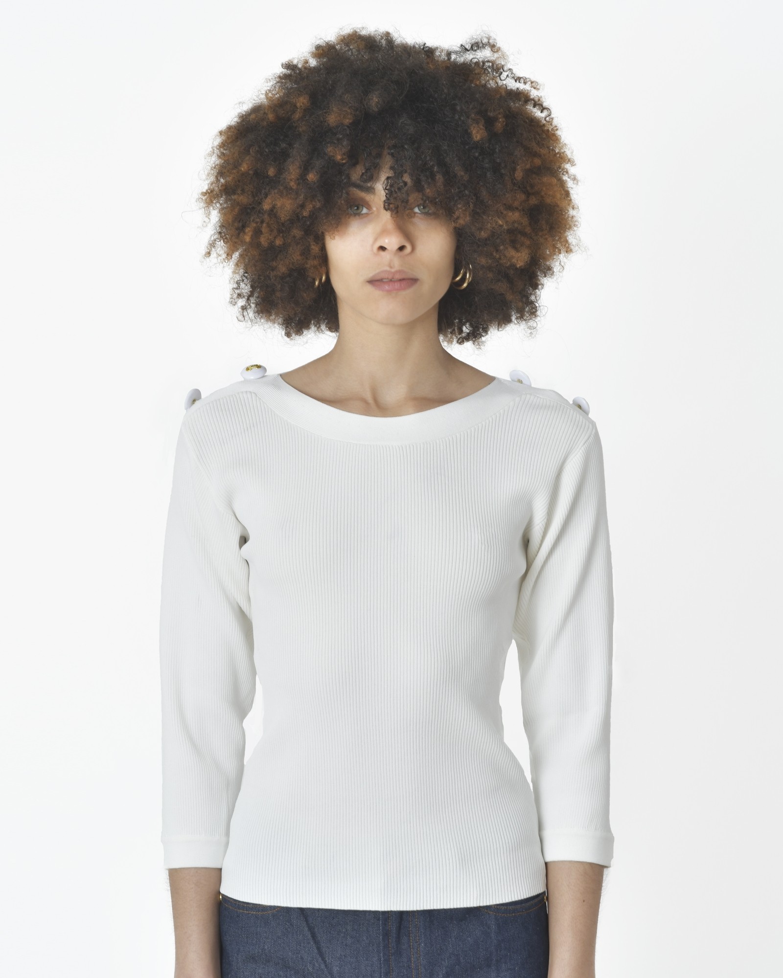 Haut maille blanc Edward Achour: Détails: Haut maille cotelé blanc, col rond, bouton blancs et dorés dur l’épaule, manches 3/4, bouton blanc et dorés au bas des manches, sans poches, ni fermeture..